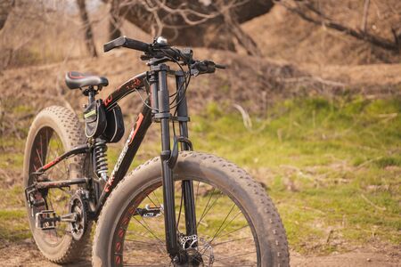 Fatbike on a path in the forest. Sports hobby for health and travel. Electric bike.