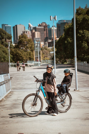 A woman and a child happily enjoying a fun bike ride while taking in a vibrant city view