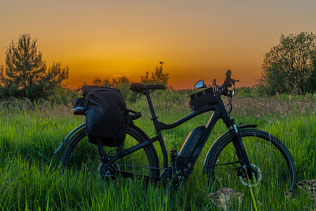 Electric bike with black bag on overgrown meadow with orange sky after sunset