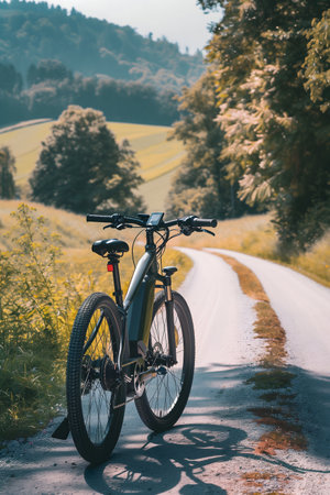 A bicycle parked on a tranquil country road in the countryside, surrounded by lush greenery and rolling hills, embodies freedom, exploration, and connection with nature.