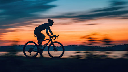 A silhouette of a cyclist on a gravel bike at dusk, with motion blur enhancing the scene.