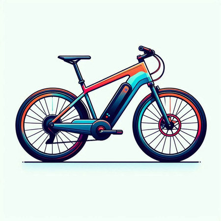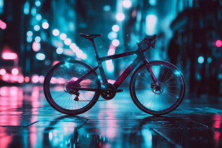 Futuristic, AI powered bicycle glowing on a wet city street at night, reflecting neon lights, in a cyberpunk style