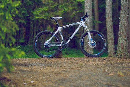 Mountain bike on the road in the forest at sunset or sunrise.