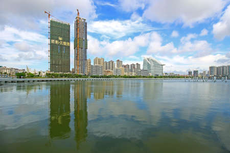 Modern skyline (International Shipping Center) in Haicang District, Xiamen city, with lake foreground during the sunset