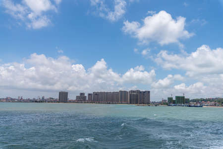 Haikou city skyline with sea and shoreline on overcast weather day in Haikou Hainan China