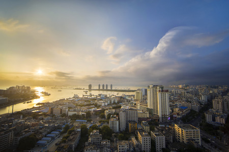 Aerial view of Sanya city with river at sunset light in Hainan province, China
