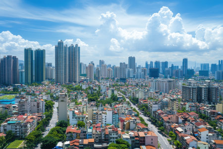 An overhead view reveals a cityscape dominated by several buildings, featuring traditional Asian architecture. The structures are complemented by a vivid blue sky dotted with large, white, fluffy clouds. This scene, marked by the bright daylight, suggests opportunities for commercial use and editorial illustrations that are suitable for various design projects.