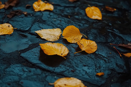 A close-up captures vibrant yellow flowers gently drifting on the water's surface, accompanied by scattered autumnal leaves. The image displays a cool color palette with soft textures and natural lighting. This serene composition offers potential for various creative projects, including editorial features or decorative elements.