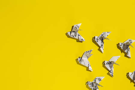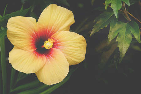 beautifully arranged collection of pressed yellow, purple, and white flowers and green leaves is displayed on a textured, aged paper background in Italy. High quality photo