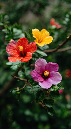 Enjoy little things text over closeup shot colorful botanic motif red flowers and green dark plants background
