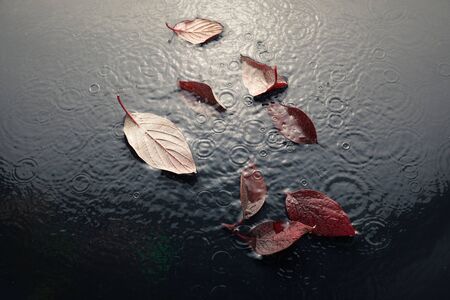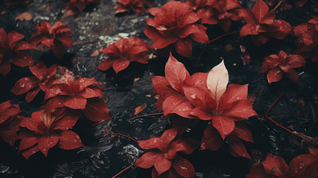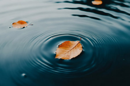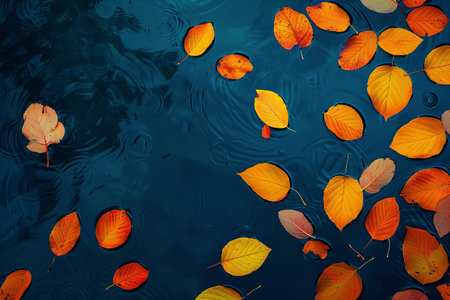 Vibrant autumn leaves floating on a tranquil water surface in an enchanting natural setting