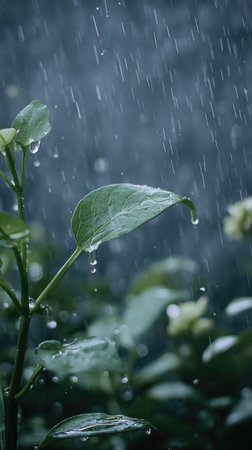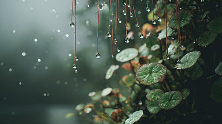 Soft rain falling gently on leaves, with water droplets forming and slowly dripping. The background is softly blurred with a natural, moody atmosphere.