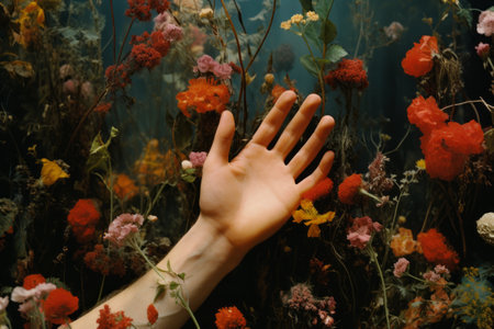 An AI-generated illustration of a female model hiding behind a vibrant flower bouquet.