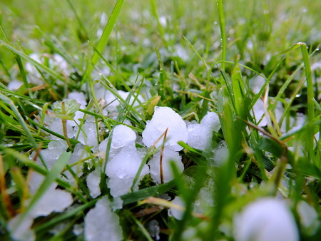 Fresh hail accumulation on green grass close-up