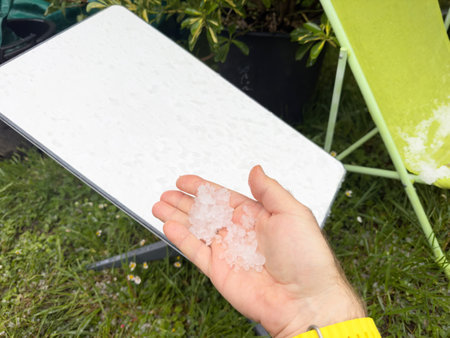 Frankfurt, Germany - Apr 21, 2024: A hand holding hailstones above a Starlink satellite internet antenna, with a green chair and plants in the background, capturing the remnants of a recent hailstorm in an outdoor setting