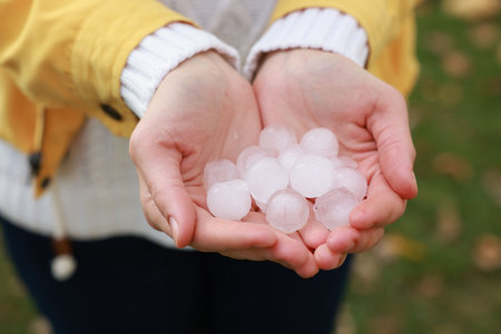 Woman holding hail grains after thunderstorm outdoors, closeup