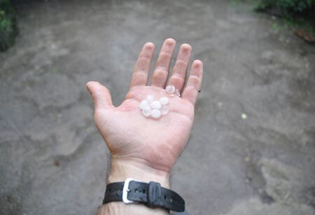 A man is holding hailstones of 8 millimeters in diameter on his palm after a severe hailstorm in spring.