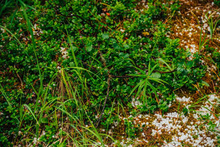 White cold ice crystals on the ground among green leaves after a thunderstorm with hail, copy space.