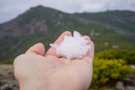 hand lies on the ground strewn with hail. A strong thunderstorm with hail
