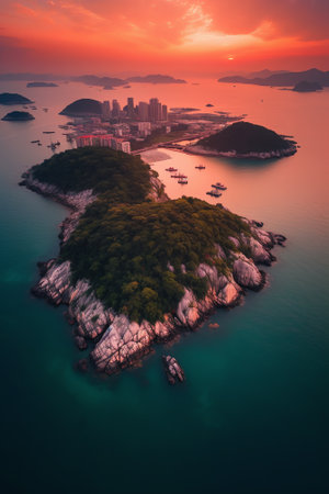 Generative AI : Aerial view of a passenger ferryboat along Hong Kong Island coastline at sunset with Hong Kong skyline in background China