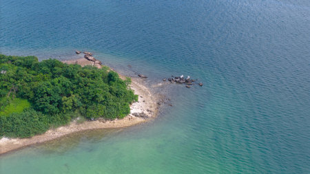 Aerial view of a secluded tropical island surrounded by crystal-clear waters