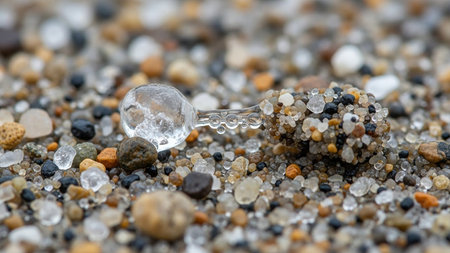 An extreme close-up of wet sand grains with tiny ice formations and a miniature glass-like object, showcasing intricate detail.