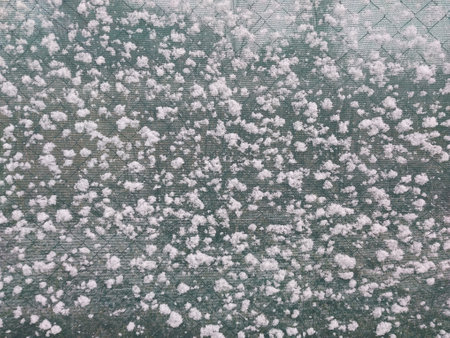 A sudden, unexpected hailstorm erupts, as small white ice pellets dramatically bounce and scatter across a vibrant green surface.