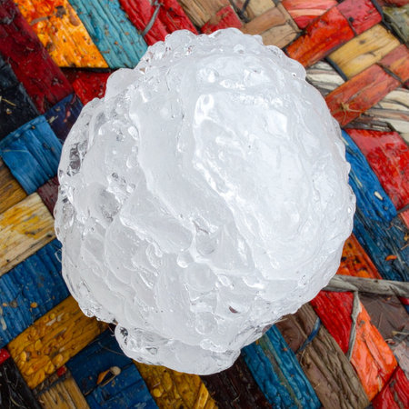 A surprisingly large, lumpy hailstone, a rare product of a powerful storm, rests momentarily on a vibrant, hand-woven traditional mat.