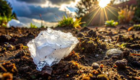 In the bright aftermath of a sudden summer storm, individual hailstones lie scattered across the warm, cracked ground.