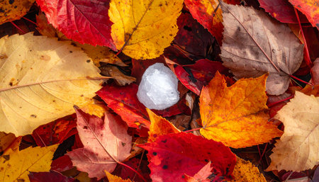 A single, icy hailstone rests starkly against a vibrant carpet of red and yellow autumn leaves.
