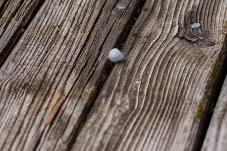 Small balls of hail, ice and hailstones from the sky on an old wooden table on a sunny day.