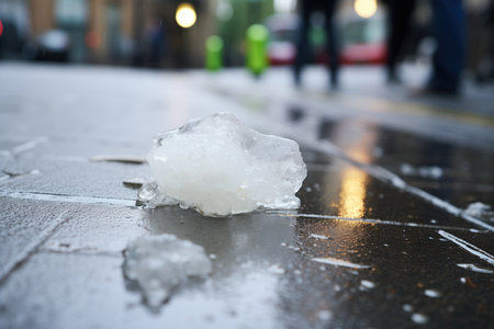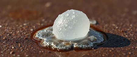 A single, large hailstone, a remnant of a recent storm, slowly melts into a puddle on the cold, wet concrete.