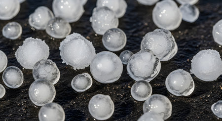 Close-up shots of hailstones of various sizes lying on the ground, showcasing the impact of their destructive force. Generative Ai