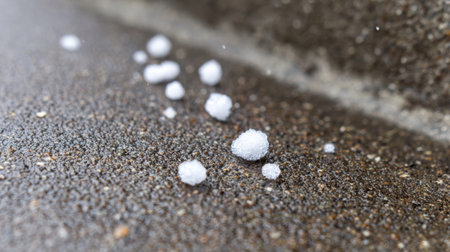 A detailed view of hailstones laying on the ground following a storm