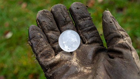 A close-up view of a large, perfectly round hailstone resting in the palm of a muddy work glove.