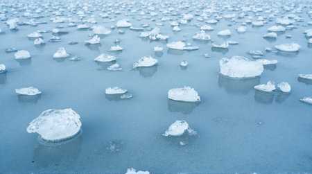 Stunning winter landscape with ice floes on frozen lake creating a beautiful icy texture background