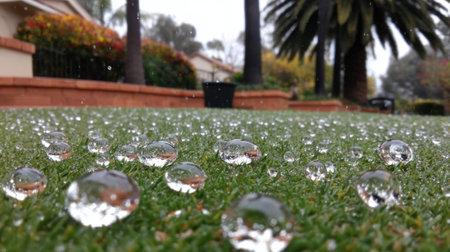 A sudden, unexpected hailstorm erupts, as small white ice pellets dramatically bounce and scatter across a vibrant green surface.
