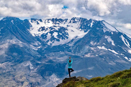 Meditation in nature by mountain. Woman in tree pose against Mount St Helens crater. St Helens National Volcanic Monument. Washington. United States of America