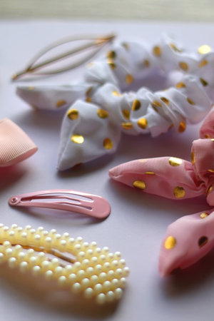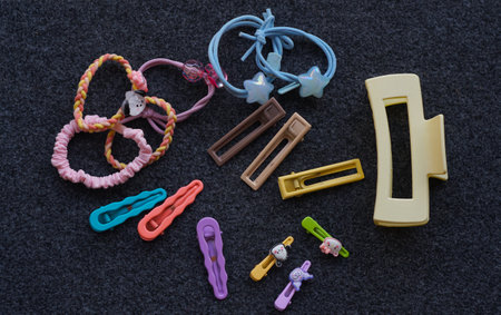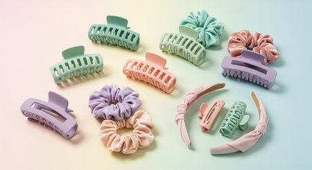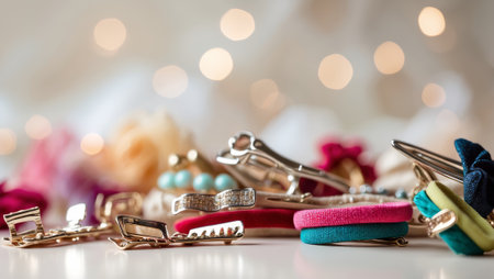 Colorful hair accessories scattered on a surface with soft bokeh background during a cozy indoor setting
