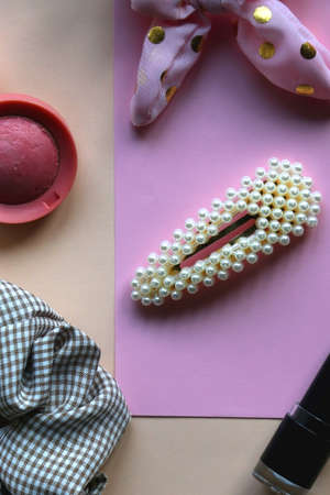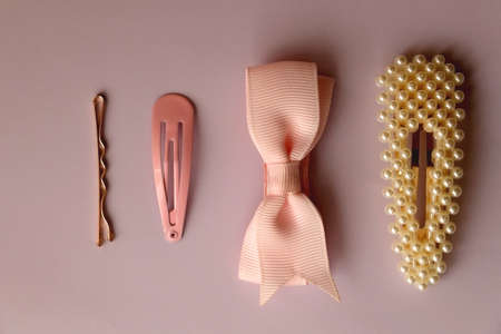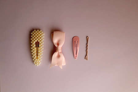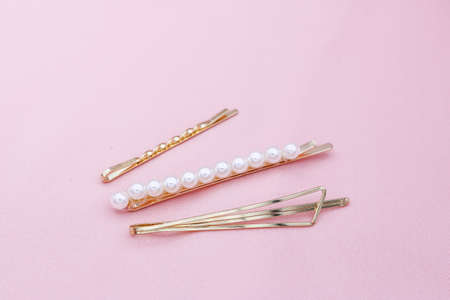 Pearl hair clips. fashionable hair accessories. Set of Hairpins different shapes with white pearls on Pink background with copy space