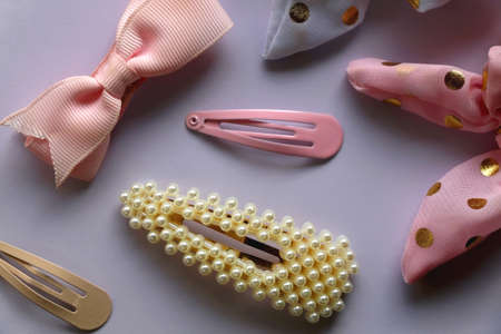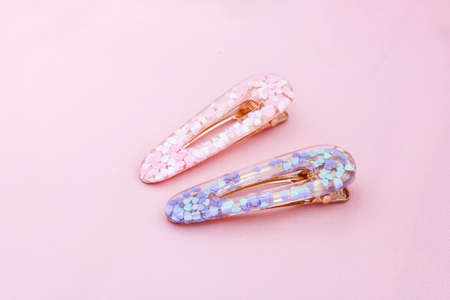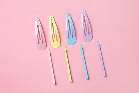 Group of colorful pastel color Hair Clips on Pink Background, Styled Shot,modern accessories for hair top view