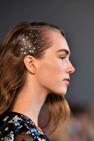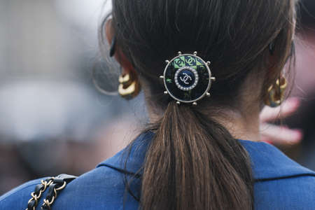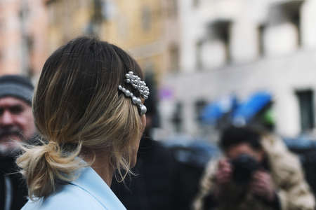 Milan, Italy - February 24, 2019: Street style – Hair brooche detail before a fashion show during Milan Fashion Week - MFWFW19