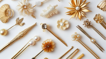 A beautiful collection of assorted vintage hair accessories featuring elegant gold and pearl designs. Perfect for adding a touch of luxury and style.