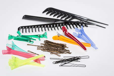 A flat lay image showcasing an assortment of hair accessories and tools, including brushes, clips, and hairpieces, perfect for beauty and grooming themes.