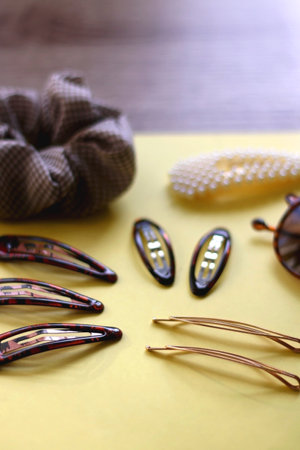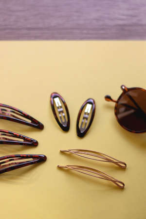 Tortoise shell sunglasses and various hair accessories on yellow background. Selective focus.
