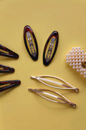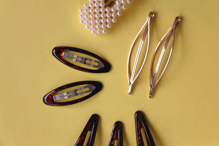 Tortoise shell, golden and pearl hair accessories on yellow background. Flat lay.