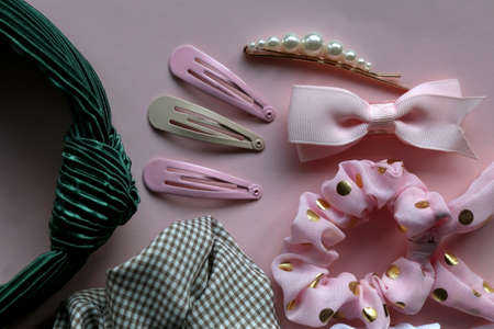 Colorful scrunchies, emerald green headband and pearl hair clips on pastel pink background. Flat lay.