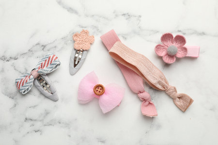 A close-up of an assortment of decorative hairbands with bows and pom-poms, arranged on a white surface to emphasize their vibrant and cute details