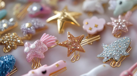 A detailed view of cute hair clips with whimsical animal and star designs, highlighting their fun and eye-catching features up close.