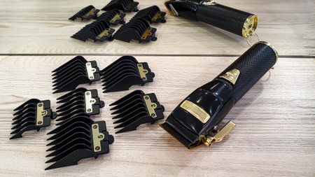Hairdressers tool. Hair clipper on white wood with nozzles of different sizes.